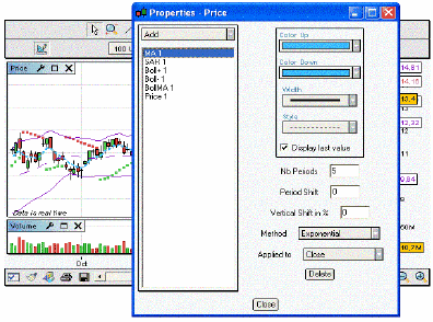 Now, let's introduce a 5 days moving average, 20 days Bollinger and standard Parab SAR on the Alcatel candlestick chart.Launch the "Properties Price" window and click at "Add" drop-down menu to include them one by one.